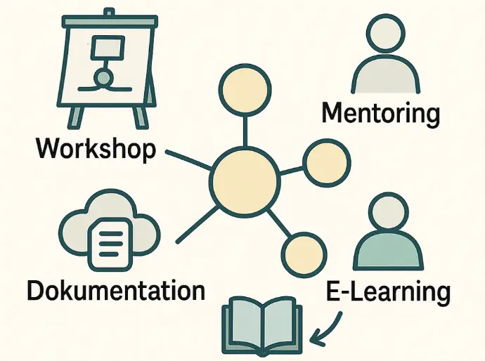 In Mentoring- und Coaching-Formaten wird praxisnahes Wissen direkt weitergegeben. Ergänzt wird dies durch Train-the-Trainer-Konzepte, die Multiplikatoren in der Organisation stärken. Video-Tutorials und Screencasts sorgen für niedrigschwelligen Zugang zu Schulungsinhalten – ortsunabhängig, wiederholbar und verständlich.